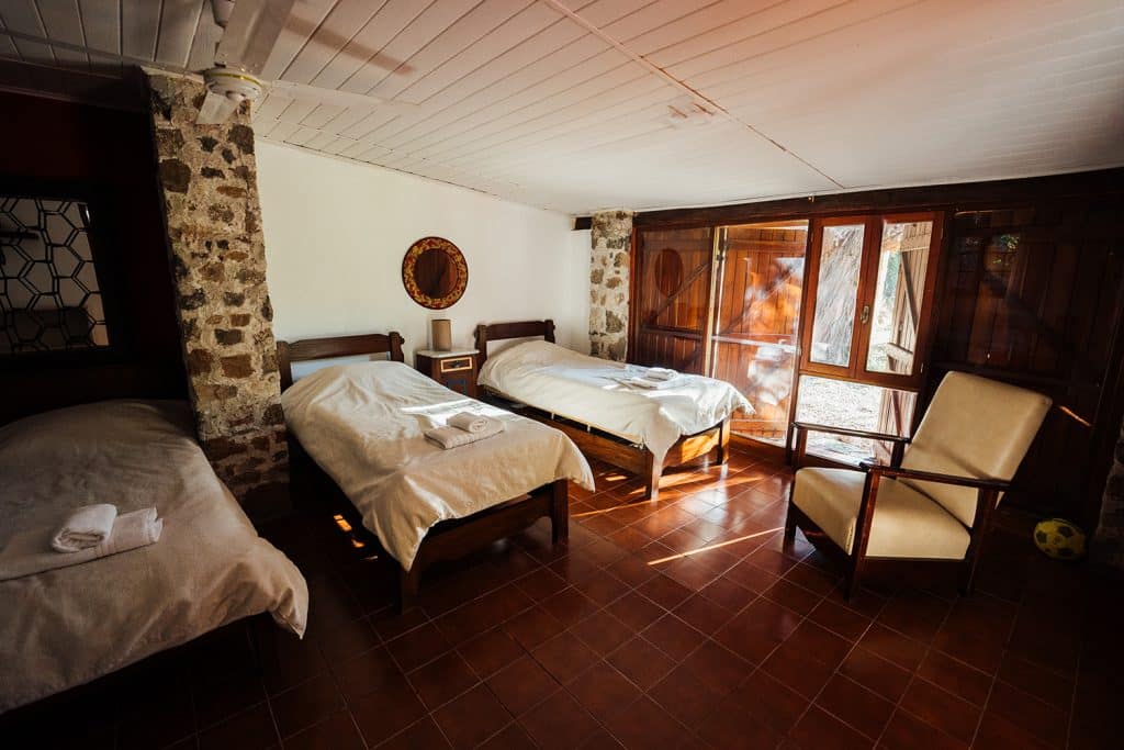 Un predio de 300 hectáreas, 3 casas compartidas con habitaciones individuales, dobles y cuádruples, 5 baños, cancha de tenis y ping pong.